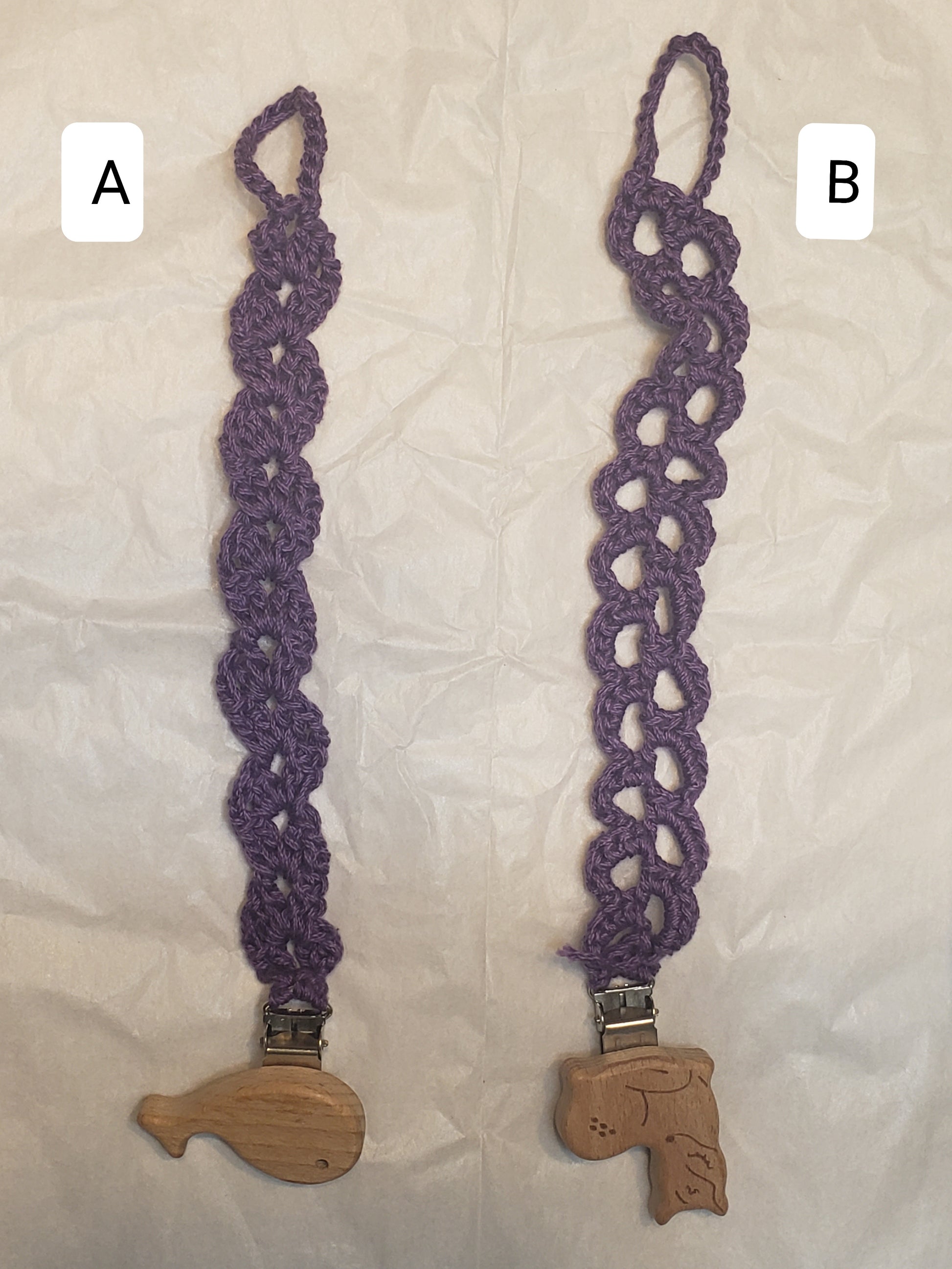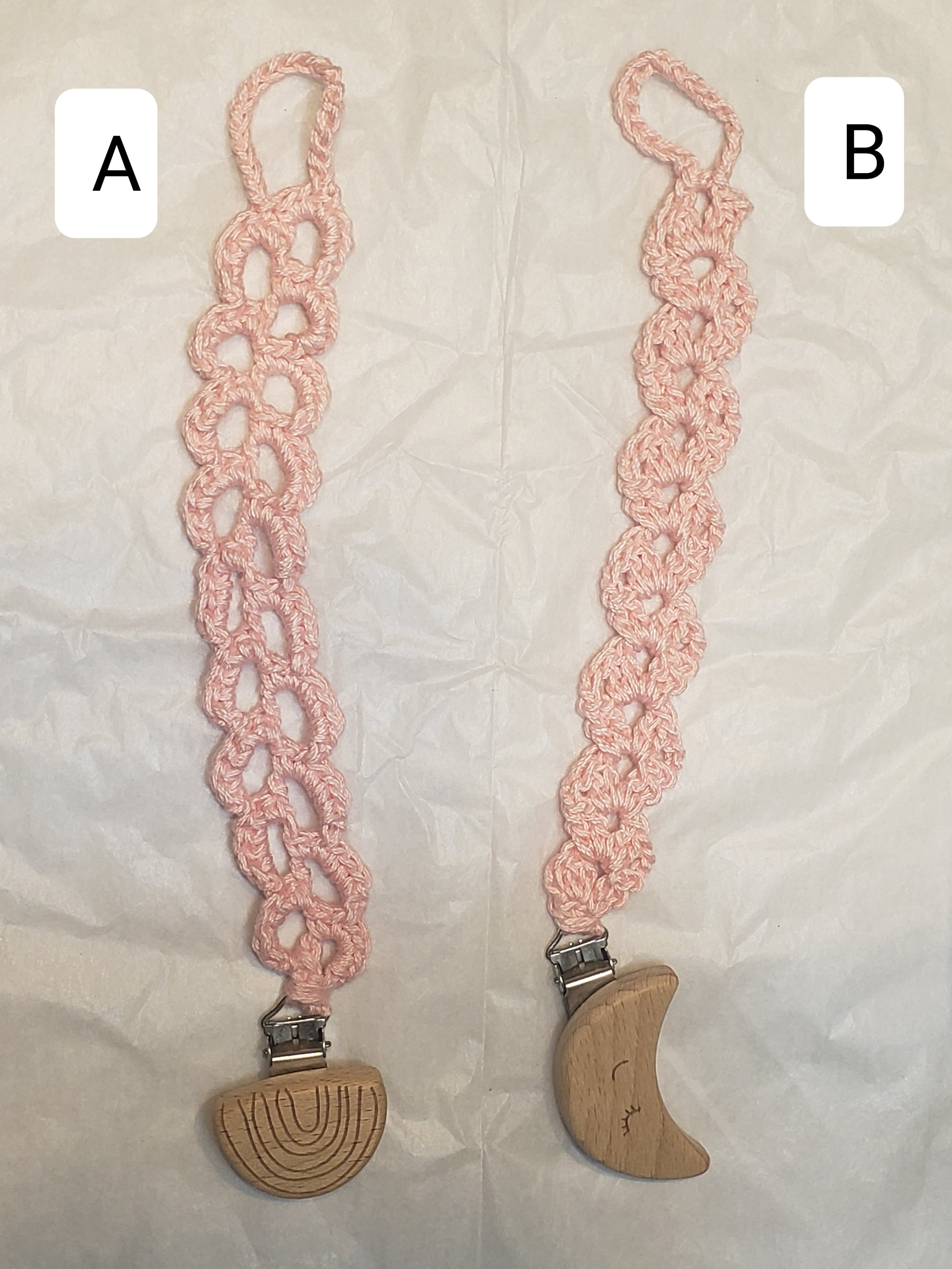 Pick A or B design.This baby crochet pacifier holder is a must-have for new mothers. Made with high-quality materials, it is designed to keep a baby's pacifier clean and close by. A thoughtful and practical gift, it is the perfect addition to any baby essentials list.